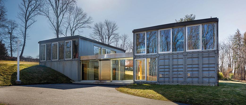 This modern, industrial structure is comprised of steel shipping containers and walls of windows – letting light and views of nature in from every vantage point. The two-story 4,000 square-foot residence is perfectly sited on about 3.3 acres, taking full advantage of the captivating views from every angle. Juxtaposed against the natural beauty of the property are the home’s simple and modern lines. The corrugated steel façade with high gloss ship-grade finish, as well as the exposed steel beams, poured concrete and upcycled reclaimed flooring found throughout the interior, all contribute to the home’s timeless modern aesthetic.